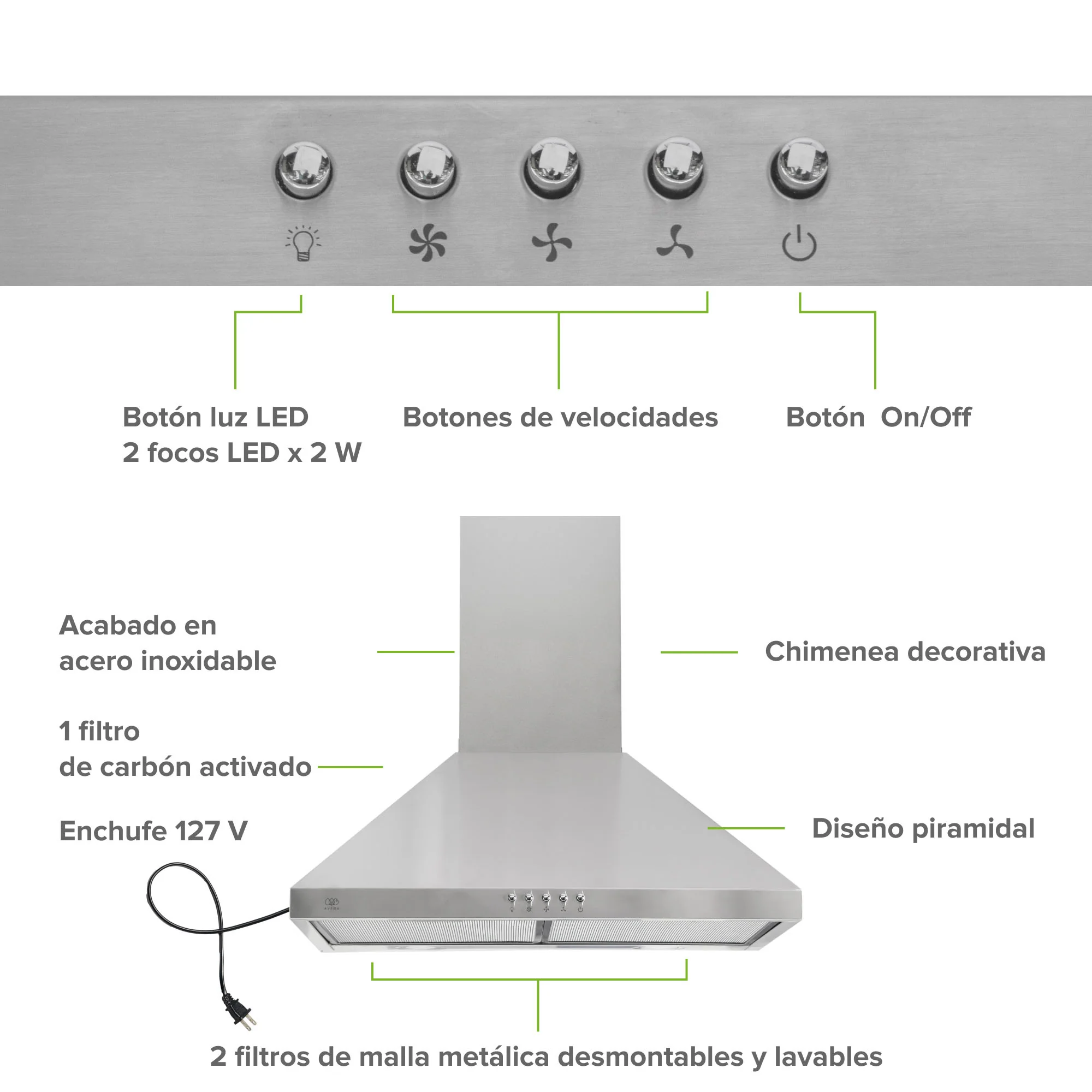 Imagina un hogar donde los aromas de tus platillos favoritos permanecen, pero el humo y la grasa desaparecen al instante. Esta campana extractora piramidal de 60 cm ha sido diseñada para integrarse con el estilo de vida de los hogares mexicanos, ofreciendo una solución eficiente que mantiene tu cocina impecable mientras te concentras en lo que realmente importa: crear momentos inolvidables.