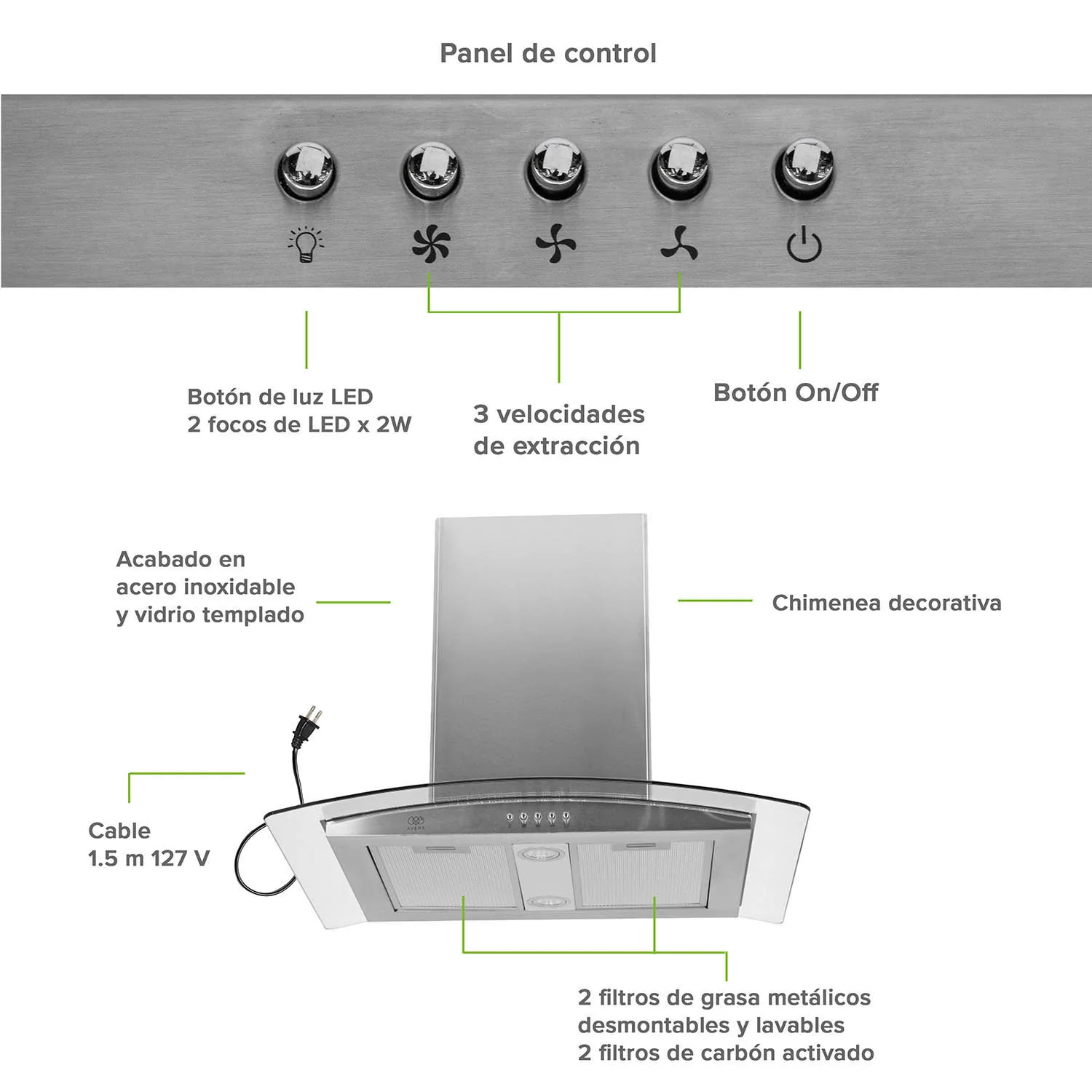 Modelo: CEVD90C — Dimensiones: 76 cm de ancho, 60 cm de fondo y hasta 125 cm de alto (ajustable). Materiales: Estructura de acero inoxidable y vidrio templado curvo de alta resistencia. Filtración: Incluye 2 filtros metálicos lavables y 2 filtros de carbón activado. Conexión: 110-120V ~ 60Hz con motor de 234 W.