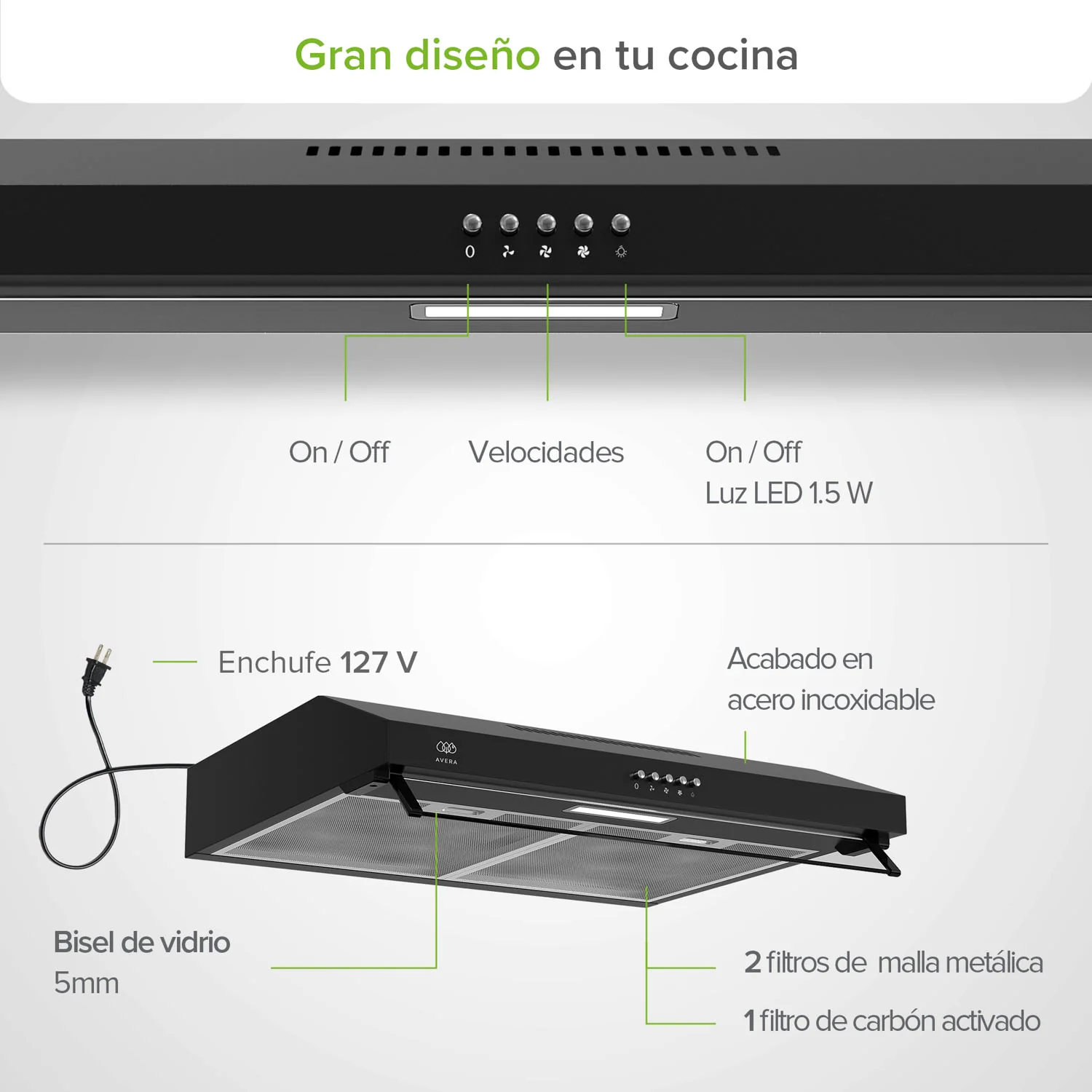 - Doble Tecnología de Filtrado: Incluye filtros de malla metálica lavables para atrapar la grasa y filtros de carbón activado que neutralizan los olores de forma efectiva.