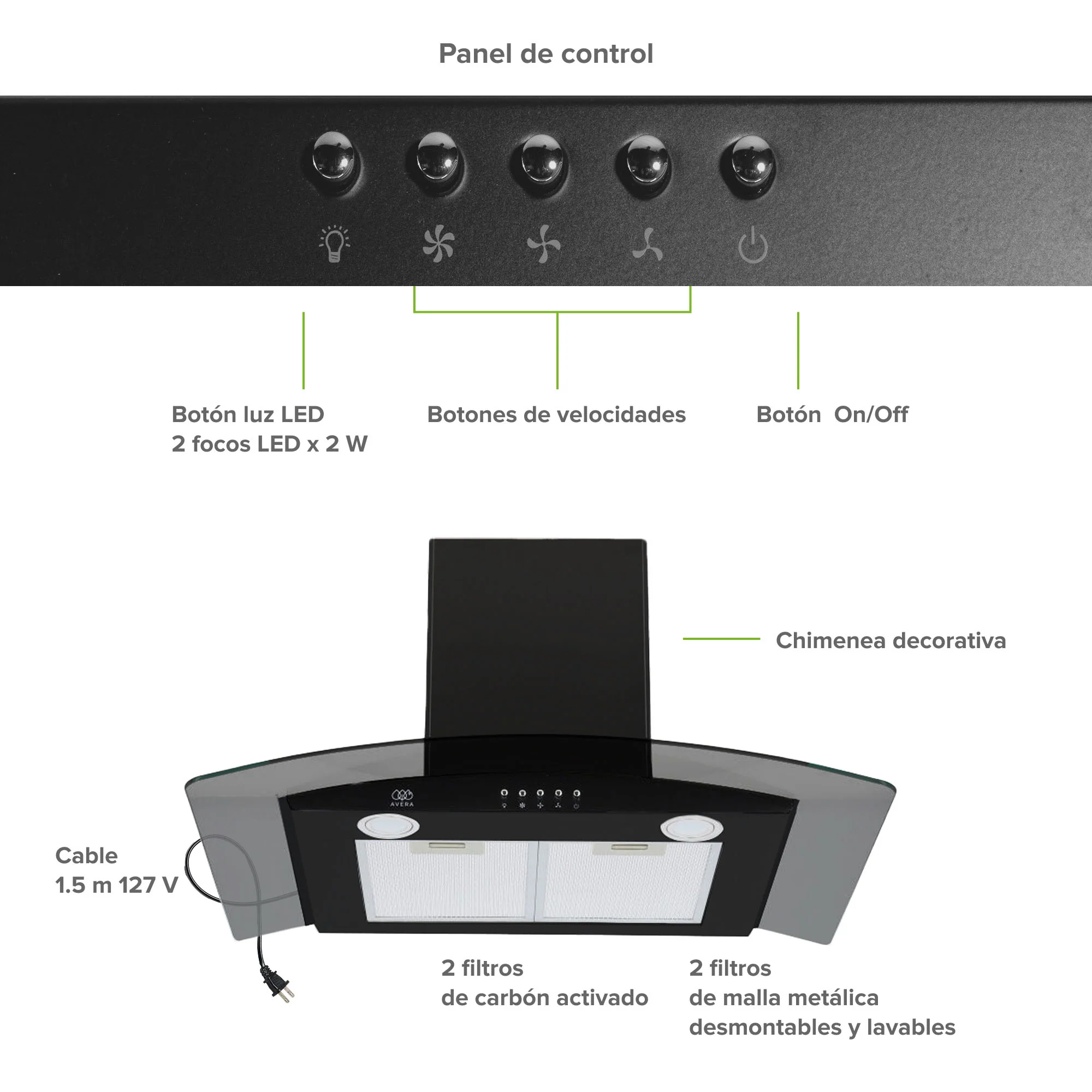 Sistema de Filtrado: Incluye 2 filtros de grasa metálicos lavables y 2 filtros de carbón activado para purificación.