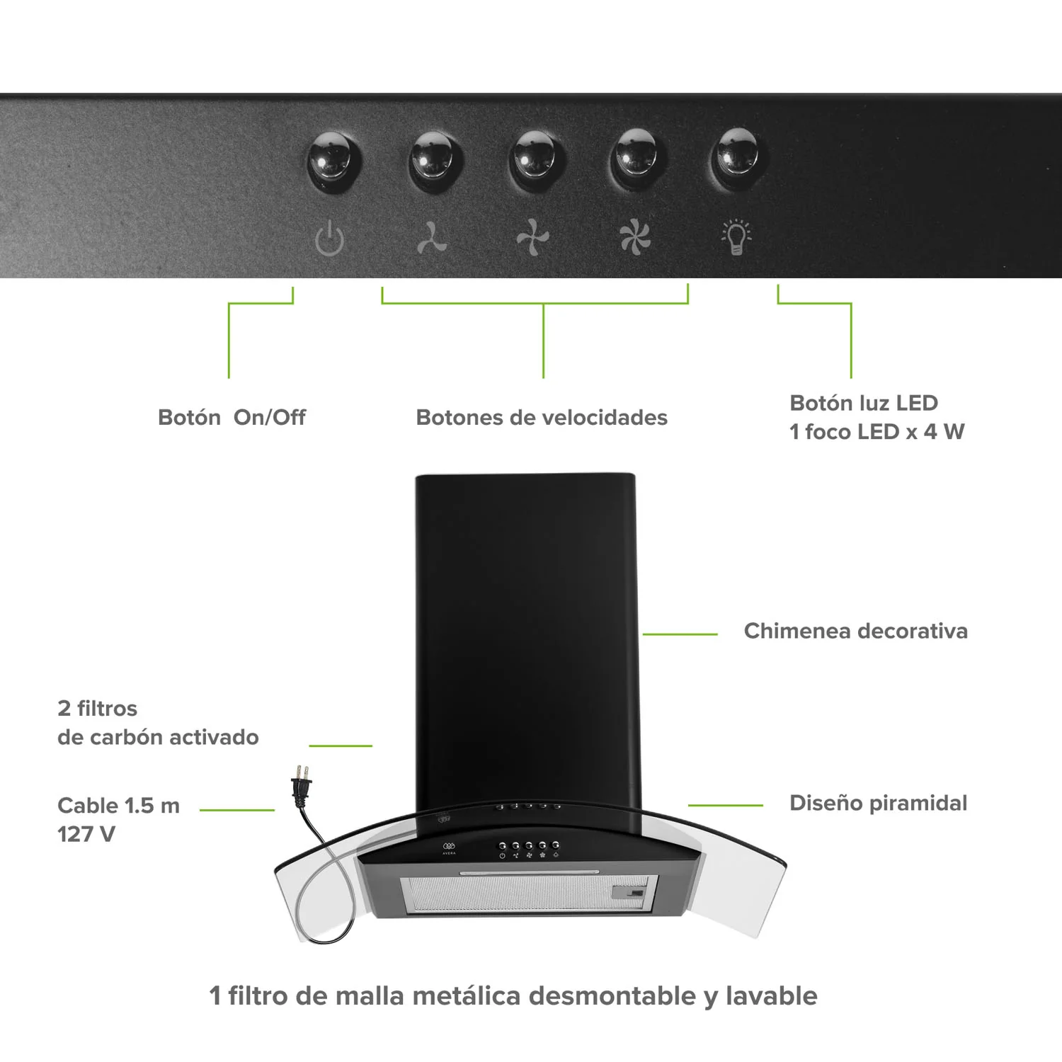 Dimensiones: 60 x 37.6 x 75.8 cm. Material: Acero inoxidable y vidrio templado negro. Potencia de extracción: 400 m³/h. Niveles de velocidad: 3 ajustes controlados por panel de botones. Sistema de filtrado: 2 filtros de carbón activado y 1 filtro de malla metálica lavable. Voltaje: 127 V — 60 Hz. Consumo: 105 W.