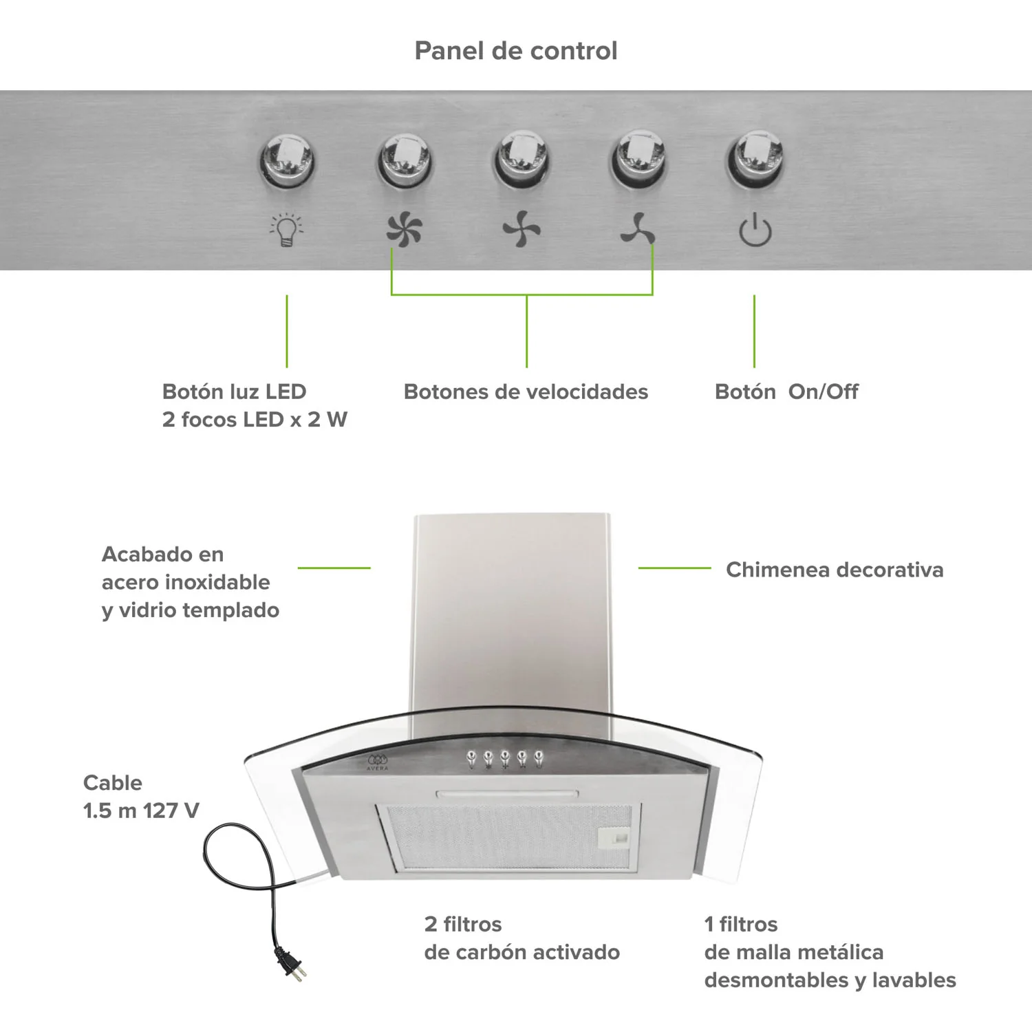 - Visibilidad Total: La iluminación LED integrada ofrece una luz clara y eficiente sobre tu estufa para que no pierdas detalle de tus cocciones.