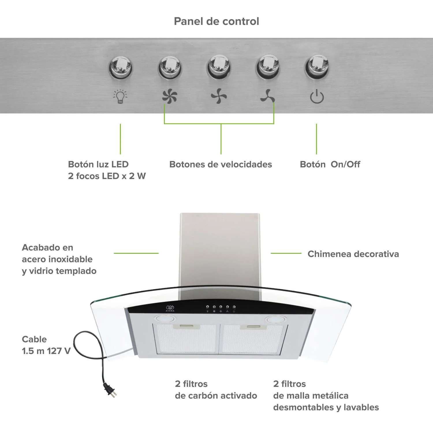 Dimensiones: 76 x 50 x 55.5 cm. Materiales: Acero inoxidable y vidrio templado de alta durabilidad. Capacidad de extracción: 500 m³/h. Potencia: 144 W. Voltaje: 127 V. Panel de control: Botones intuitivos con 3 velocidades (Baja, Media, Alta). Filtros incluidos: 2 metálicos lavables y 2 de carbón activado.