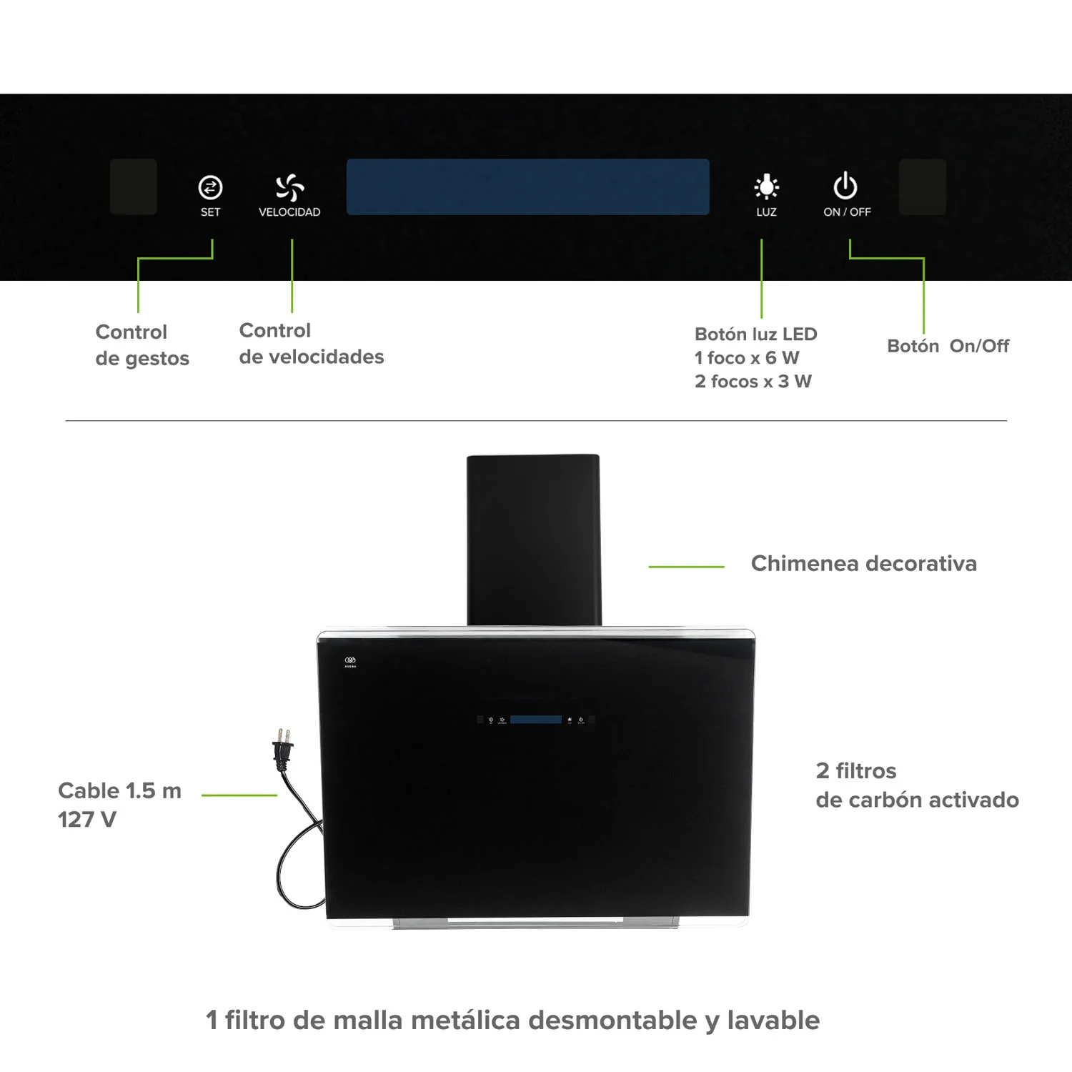 Control de Gestos Inteligente: Gestiona las 4 velocidades y el encendido sin tocar el panel digital. Mantén la superficie de vidrio impecable y libre de grasa mientras cocinas tus platillos favoritos.