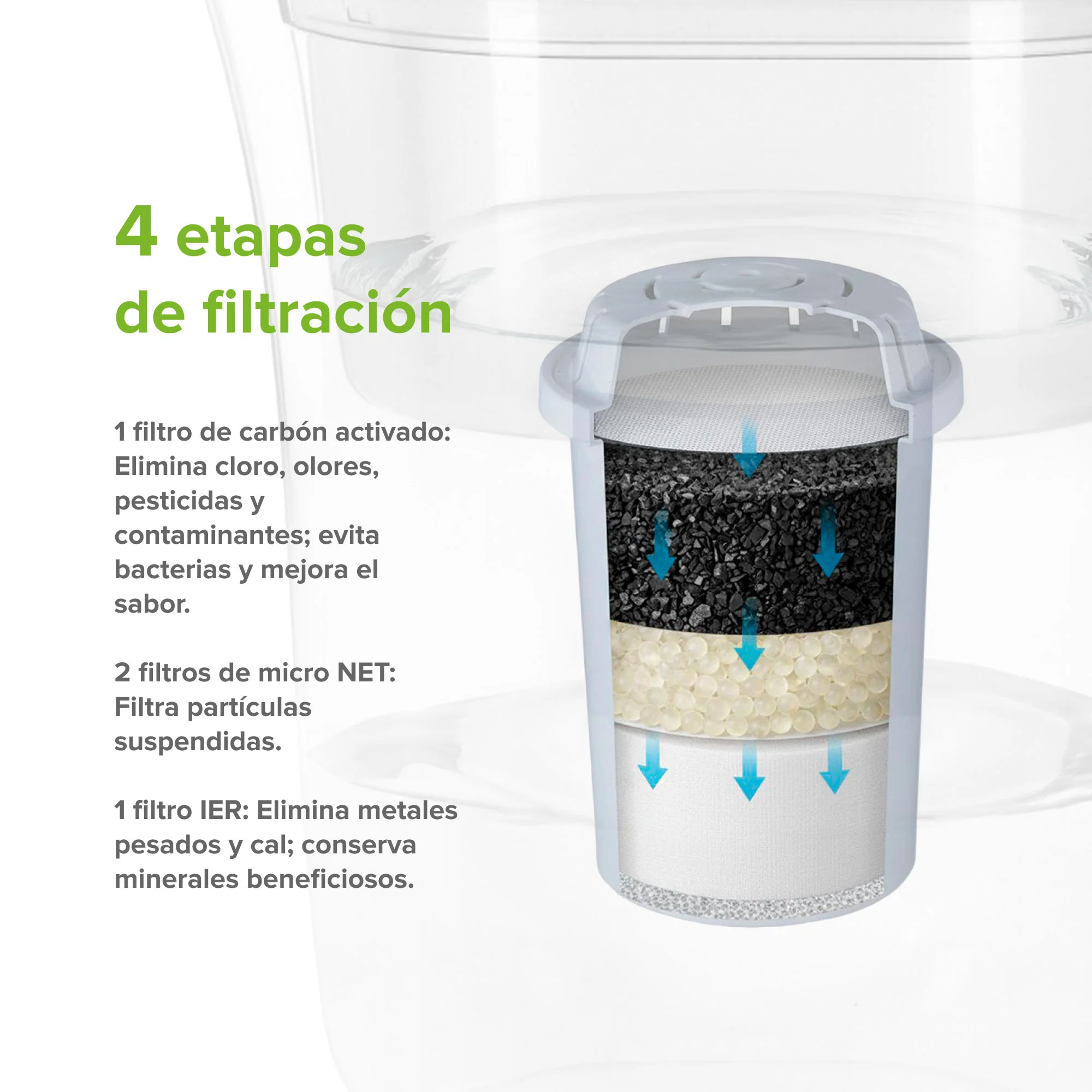 - Filtración Completa: Con una combinación de filtros carbón activado, micro NET e IER, el agua que consumes es de la mejor calidad.