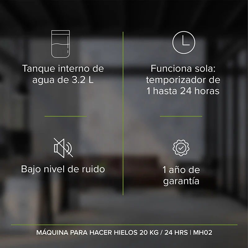 Cada ciclo dura aproximadamente 14 minutos y la máquina produce 24 cubos por ciclo, puede producir 20 kg de hielo en un día.