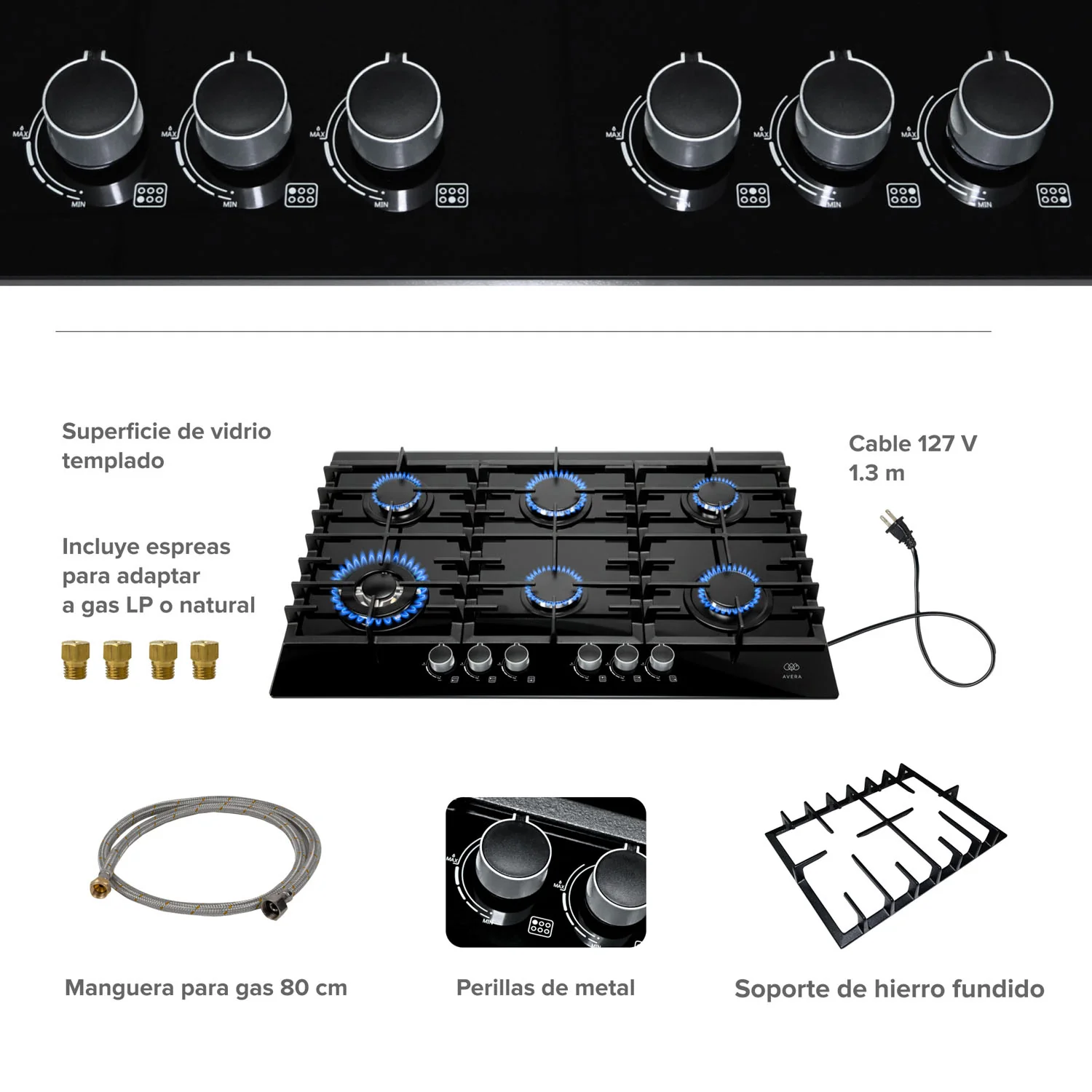 Materiales: Vidrio templado de alta resistencia, perillas metálicas y soportes de hierro fundido.
