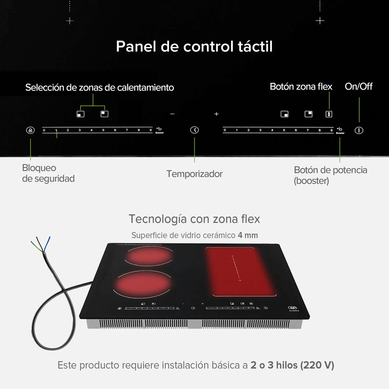 Parrilla de inducción 4 quemadores 59 cm 1 zona flex con función booster 7000 - 8000 W 220V