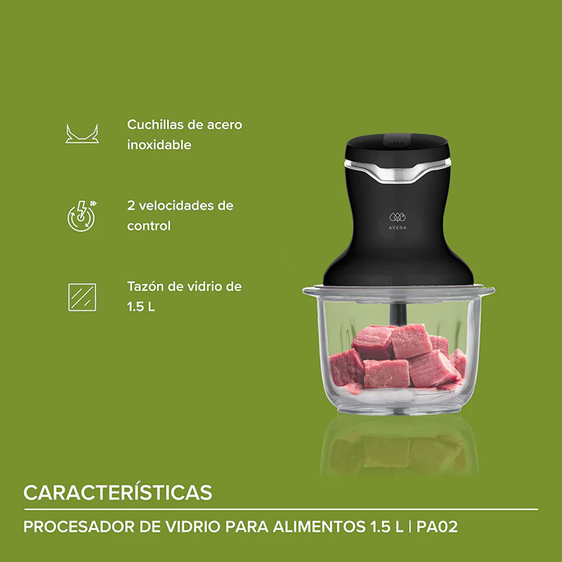 Procesador de alimentos de vidrio 1.5 L con 4 cuchillas de acero inoxidable y 2 velocidades