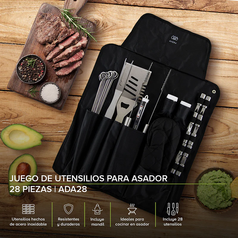 Conviértete en el anfitrión que siempre soñaste y toma el control total de cada asado. Este kit de 28 piezas de acero inoxidable te brinda las herramientas necesarias para que cada reunión al aire libre sea una experiencia culinaria impecable. Diseñado para el parrillero mexicano que busca precisión, durabilidad y estilo en un solo lugar.